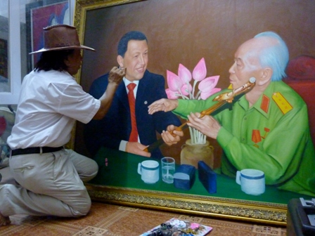 Su primer encuentro con el Comandante Chávez se produjo hace dos años, entre la paleta, el pincel y los colores, sobre un lienzo de gran formato, versión pictórica de la gráfica capturada por el coronel fotoreportero Tran Hong, cuando el líder bolivariano obsequió al legendario general de Dien Bien Phu, Vo Nguyen Giap, una réplica de la espada de El Libertador.