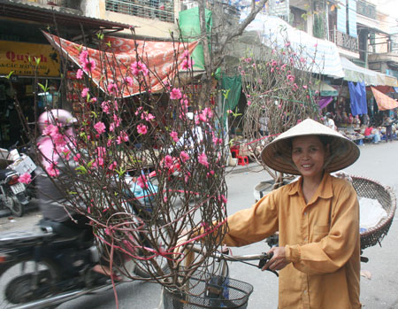 Para llenar el ambiente festivo del Tet, no se puede faltar Hoa Dao (árboles o ramas de melocotonero) en las localidades del norte