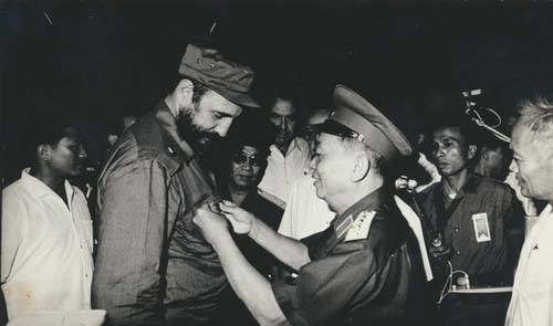 Fidel en el Museo del Ejército Popular de Vietnam; Giap le coloca el sello Combatientes de Dien Bien Phu. (imagen tomada de INTERNET).