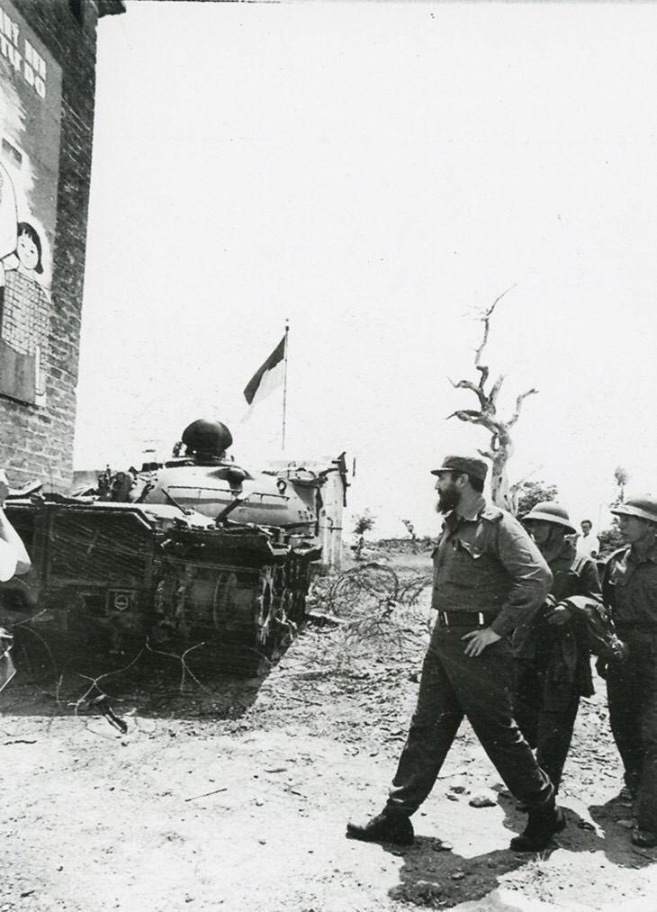El líder cubano observa un vehículo militar norteamericano, destruido por fuerzas vietnamitas en la batalla de Quang Tri. |