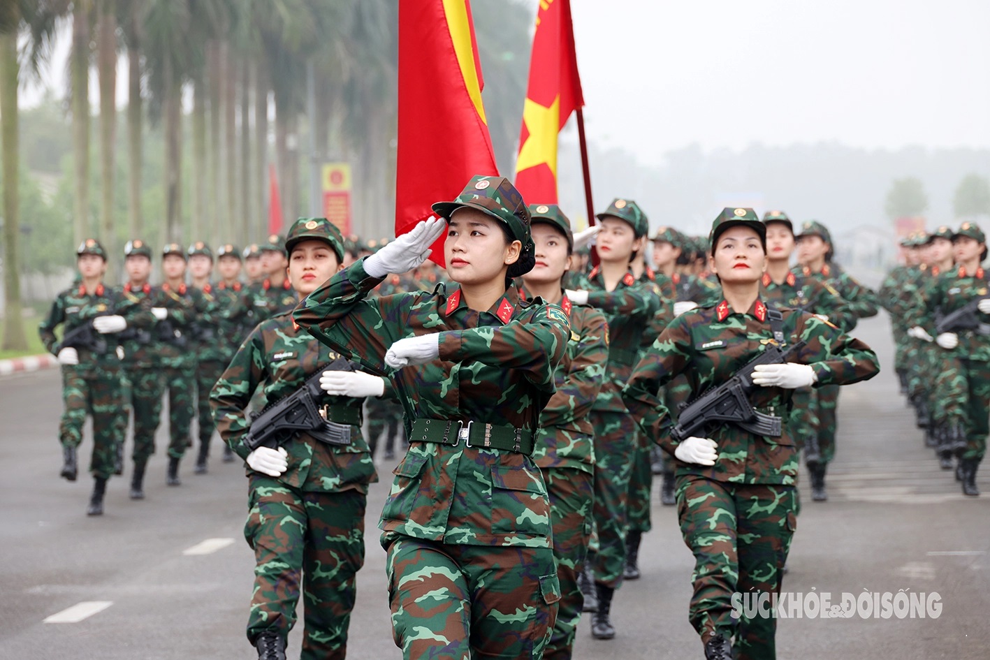 Mujeres soldados vietnamitas listas para participar en el desfile militar para conmemorar el septuagésimo aniversario de la Victoria de Dien Bien Phu. (Foto: suckhoedoisong.vn)