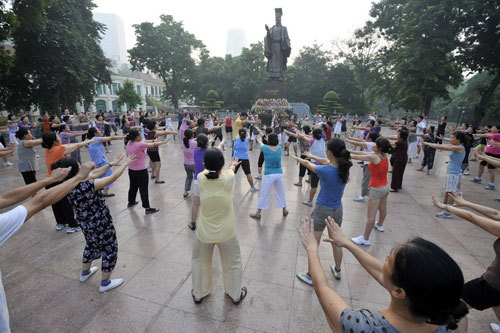 A las 6 horas de la mañana, cientos de personas frecuentan el monumento del rey Ly Thai To para practicar el yoga de la risa. Se trata de una disciplina yóguica que proporciona los beneficios psicológicos, bioquímicos y fisiológicos. Los participantes en estos ejercicios pueden reír sin motivo alguno ni hacer falta acudir a chistes o comedias. Cada sesión dura de 30 a 45 minutos, divididas en varias partes: elongación, respiración y juegos de pantomima que provocan la risa. El maestro puede inventar diferentes modos de risa en combinación con la respiración para aumentar el oxígeno en nuestro cuerpo y crear endorfinas en nuestro cerebro. Nos reímos como un ejercicio provocado pero pronto fluye la risa verdadera.Además, el Club del Yoga de la Risa de Hanoi practica actividades de entretenimiento como cantar, bailar, masajear la espalda y gritar a fin de despertar la alegría de nuestro “niño interior”. Fundado en 2009, ese grupo contribuyó a extender esta tendencia saludable en toda la capital.