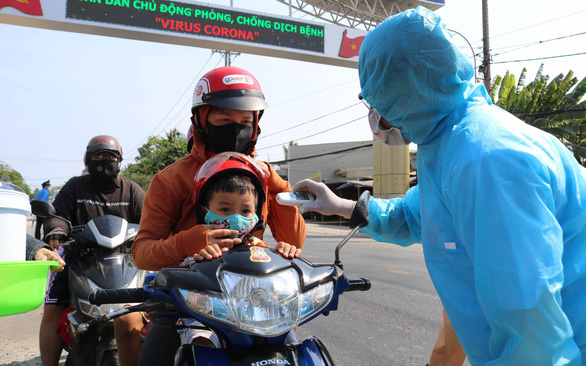 Medir la temperatura corporal en un puesto de control epidémico en el distrito de Binh Chanh, Ciudad Ho Chi Minh (Foto: tuoitre.vn)