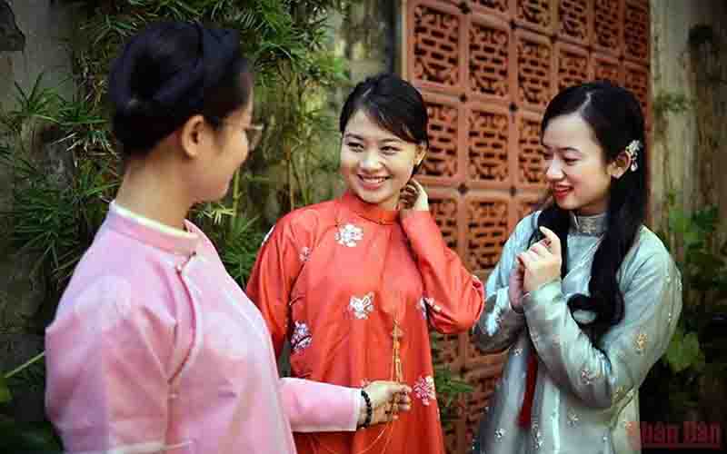 Muchachas vietnamitas vestidas de la túnica tradicional Ngu Than. |