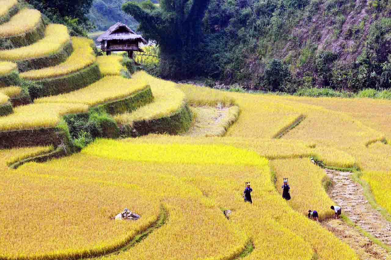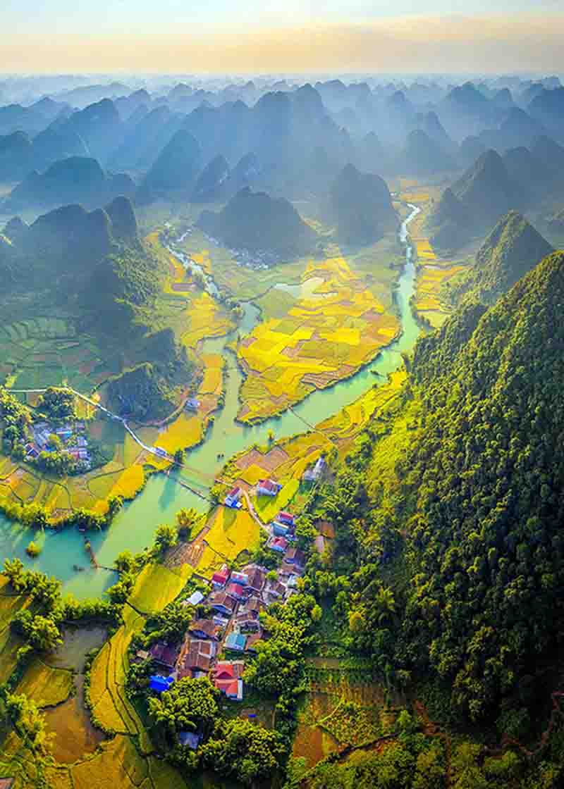 Paco: De verdad, Vietnam es un país con muchos paisajes hermosos. Los campos de arroz amarillo maduro bajo el sol con una belleza suave y armoniosa son imágenes típicas de las provincias montañosas del norte de Vietnam. Tuve la oportunidad de visitar la provincia de Cao Bang, donde a principios de octubre los visitantes suelen admirar los arrozales maduros en el valle de Phong Nam. Al pie de la montaña se encuentran los tejados de la comunidad étnica Tay, con unos 20-30 hogares. Y quizás la imagen más impresionante es la del río Quay Son, el cual serpentea por los campos. Además, durante este viaje, aproveché la oportunidad para visitar la cascada de Ban Gioc, conocida como la más hermosa de Vietnam con capas sucesivas que se extienden a cientos de metros. Esta catarata situada en la comuna de Dam Thuy, donde fluye el río Quay Son, tiene dos arroyos principales. Los meses de septiembre y octubre son el momento ideal para explorar Ban Gioc, porque el agua es abundante y clara, con espuma blanca. Los visitantes pueden alquilar balsas de bambú para recorrer el lugar a un precio de 3 dólares.