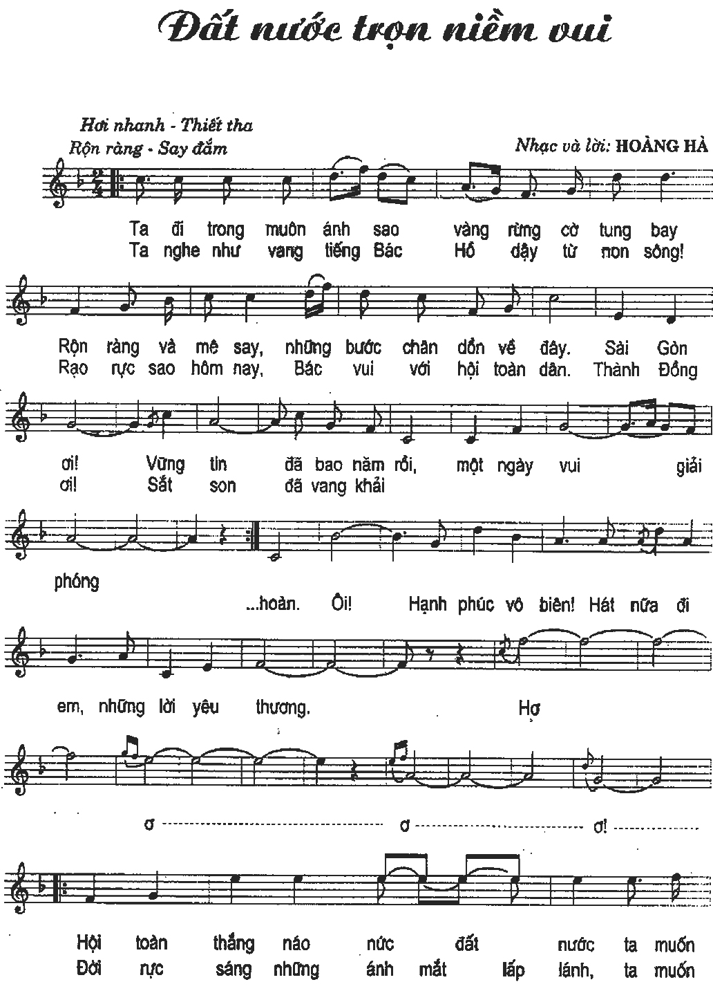 Un día después de finalizar la referida pieza, Hoang Ha la entregó a la Voz de Vietnam y la primera versión de la misma fue interpretada por el cantante Trung Kien. Con frases como “Caminamos en medio de incontables estrellas/ de las banderas que ondean” o “¡Vivimos una felicidad sin límites/ cantemos más palabras de amor!”, la melodía resonó orgullosamente para anunciar a todo el mundo la victoria de la Gran Guerra Patria del pueblo vietnamita. Luego, el título del tema fue también el de una colección de canciones sobre el acontecimiento del 30 de abril de 1975 publicada ese mismo año y otra versión de 1985. El crítico musical Nguyen Thuy Kha evaluó: “El fallecido compositor Hoang Ha escribió la canción ‘El país en plena alegría’ antes del 30 de abril de 1975. En su obra, considerada como un pronóstico de la victoria final, combinó armónicamente la música sinfónica con la ligera. Después del 30 de abril, el canto se hizo famoso en las zonas sureñas del país. Numerosos jóvenes de allí cantaban esta melodía”.