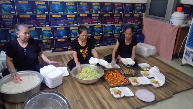 Las señoras Sau Nhan, Ut Xuan y Sau Giau preparan las porciones de comidas antes de que Ut Chu lleve al hospital (Foto: VOV)