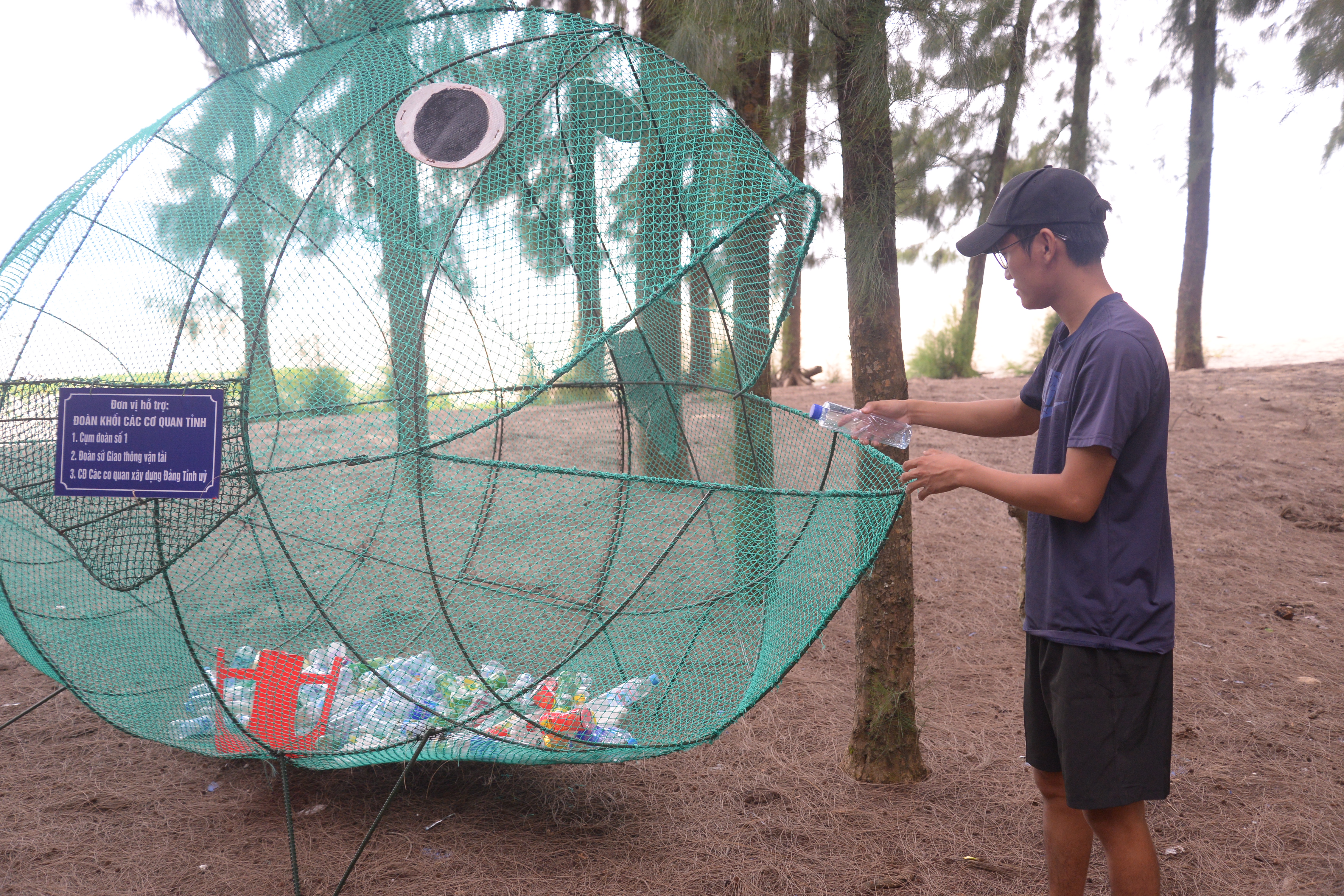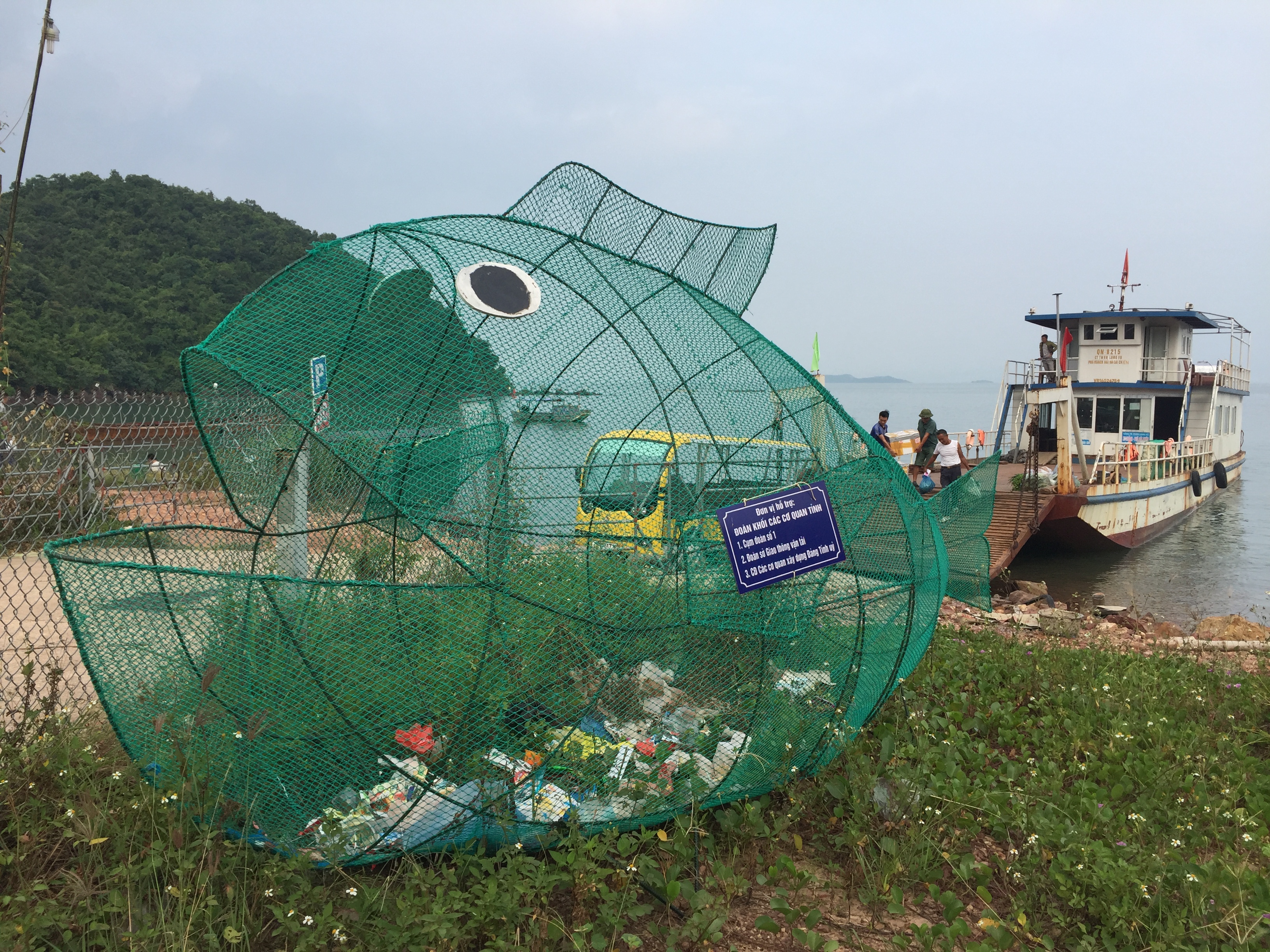 Hecho de un armazón de acero y una malla de color verde, cada uno de estos basureros mide cinco metros de largo y dos metros de altura. Fueron instalados en la estación de ferri y la playa de Cai Chien hace unos meses, con mensajes que alientan a las personas a recoger y tirar desechos plásticos en sus entrañas.