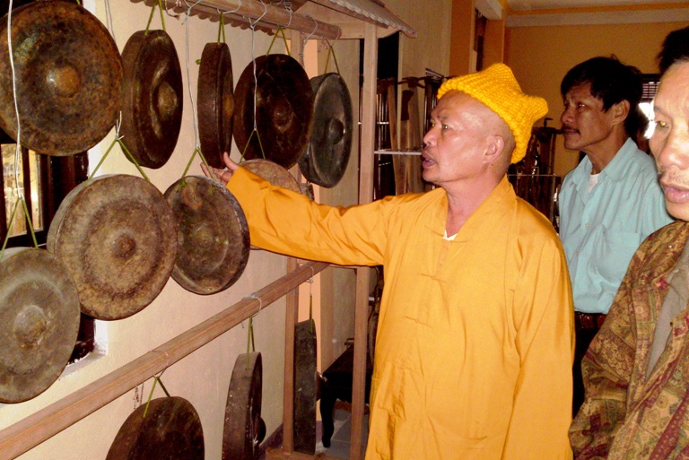 El venerable Thich Vien Thanh presenta a los visitantes su colección de gongs y batintines. (Foto: baolamdong.vn)