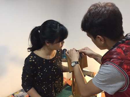 En una habitación de cerca de 20 metros cuadrados llena de instrumentos como reglas, colorantes, perforadores, Pham My Linh, estudiante de la Universidad de Cultura de Hanoi estaba haciendo los primeros puntos para su cartera de cuero. De pie, junto a ella, Do Duc Loi, dueño de Dolio, la guiaba.