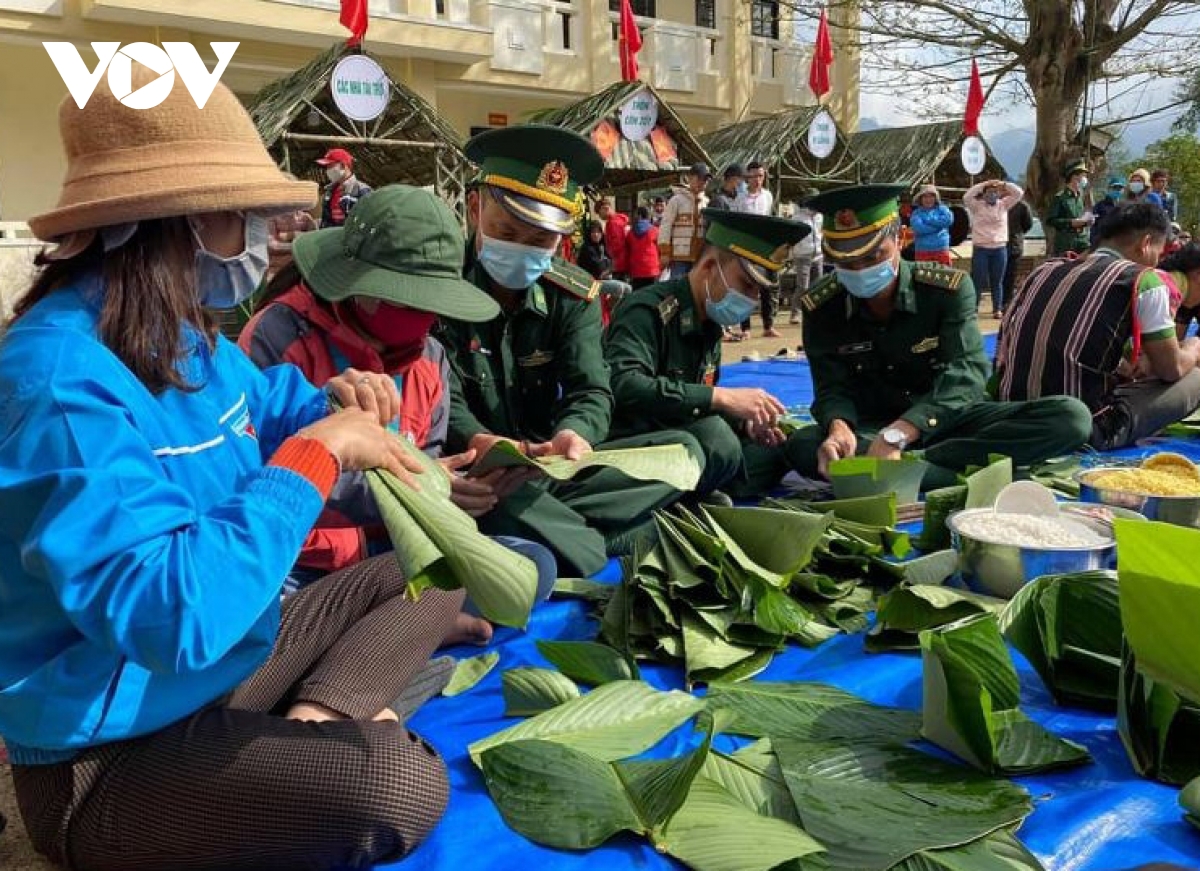 Las fuerzas de Guardia Fronteriza de la provincia de Quang Nam hacen el pastel Chung para obsequiar a los pobladores en difícil situación. |