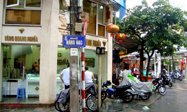 La calle de Hang Bac se sitúa en el centro del Casco Antiguo de Hanoi, en el distrito de Hoan Kiem. A pesar del paso de décadas y cambios constantes, el sitio sigue manteniendo casi intactas muchas de sus acostumbradas rutinas y estructuras de la antigua aldea del oficio de fundición de plata. A sus dos lados, se encuentran casas convencionales con techo de tejas rojas intercaladas con viviendas modernas, además de pagodas y templos de cientos años de antigüedad. Allí resalta el templo de Kim Ngan, construido desde la dinastía Le (1428-1527), donde se guardan hasta ahora muestras materiales del oficio joyero en la antigua Ciudadela de Thang Long. Estos objetos demuestran que los habitantes actuales de la calle de Hang Bac son sucesores de los primeros joyeros de la capital vietnamita. En especial, ellos han mantenido hasta la fecha los vínculos cercanos con sus clanes y parientes en la tierra natal. Pham Huy Dung, una de las personas que han vivido más tiempo en el lugar, contó: “Fue sobre los siglos XV y XVI cuando Luu Xuan Tin, que entonces tenía el cargo Thuong Thu Bo Lai (equivalente al ministro de Interior de la actualidad) fue designado a responsabilizarse de la producción de lingotes de plata para la corte. Llevó a todos los artesanos calificados de su tierra natal, aldea de Chau Khe de la actual provincia norteña de Hai Duong, y a otros de diferentes comunas como Dong Xam (Thai Binh) y Dinh Cong (Hanoi) a establecer un barrio de oficio en la Ciudadela de Thang Long. Desde entonces, en el lugar se desarrolló también el diseño y la fundición de plata como joyería y utensilios.”