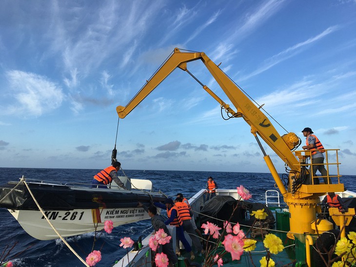 Como ya es habitual, los buques KN261 y KN263 de las fuerzas de inspección pesquera se encargan de llevar vituallas y presentes del Tet a los militares acuartelados en los puestos ubicados en la plataforma continental en el sur del país. La tarea no es nada fácil, sobre todo en esta temporada caracterizada por fuertes vientos y altas olas.