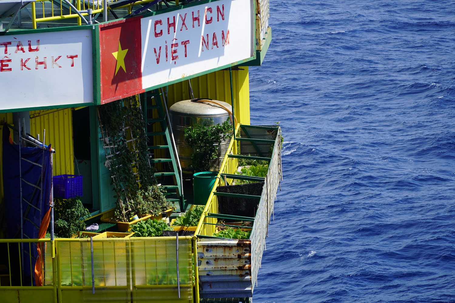 Contenedores de poliestireno y plástico son aprovechados para crear huertos, con la tierra traída de la parte continental. Según la experiencia de los soldados de la plataforma, las plantas enredaderas como las hojas de mostaza, la espinaca china y la paederia son las que se adaptan mejor a las condiciones climáticas en las plataformas, a veces extremas. El comandante Phan Cong Phung, comisario político de la plataforma DK1/16, compartió: “En esta zona básicamente hay dos estaciones: una de lluvias y otra calurosa, con un clima muy riguroso. El calor es abrasador y en la temporada lluviosa, de noviembre a febrero, las tormentas afectan mucho la vida y la producción en las plataformas en el mar. El viento es tan fuerte que hace marchitar las hortalizas. Tenemos que cubrirlas bien para poder salvarlas. Aun así, el rendimiento solo es del 20 al 30%”.