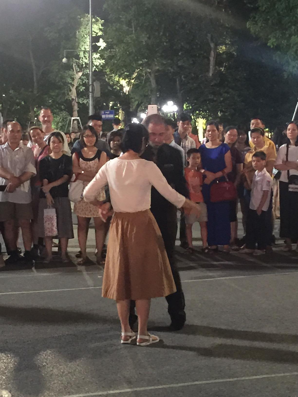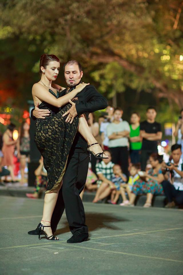 A las 19:30 horas, algo lejos se escucha la dulzura de la melodía clásica resonando desde amplificadores colocados en una bifurcación de las calles Hang Dau y Dinh Tien Hoang lo que atrae la atención de quienes caminan por la vía peatonal de Hoan Kiem, uno de los lugares más concurridos de la capital vietnamita. Cerca de la acera, la multitud rodea un par de tangueros bailando ávidamente. La artista Julieta Biscione lleva un atractivo vestido negro, el mismo color de la ropa de su colega Roberto Castillo. Se intercambian mutuamente miradas amorosas, mientras que sus piernas se mueven al ritmo de cada nota musical. A través de un lenguaje corporal y emociones personales, se refieren a una historia de amor bailando al ritmo de la canción Libertango.