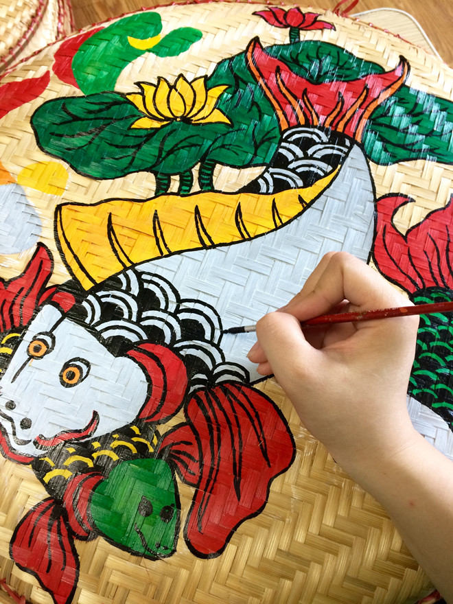 “Trato de elegir las cestas cuyas fibras tejidas están más ajustadas, luego las proceso y elimino las que sobran. Dibujar en este material no es tan sencillo como en otros. Por lo tanto, primero tengo que usar tiza para delinear la forma de la imagen, luego pintar con colores y agudizarlos con un pincel pequeño. Finalmente, aplico una capa de brillo sobre el producto y lo dejo secar un día”.