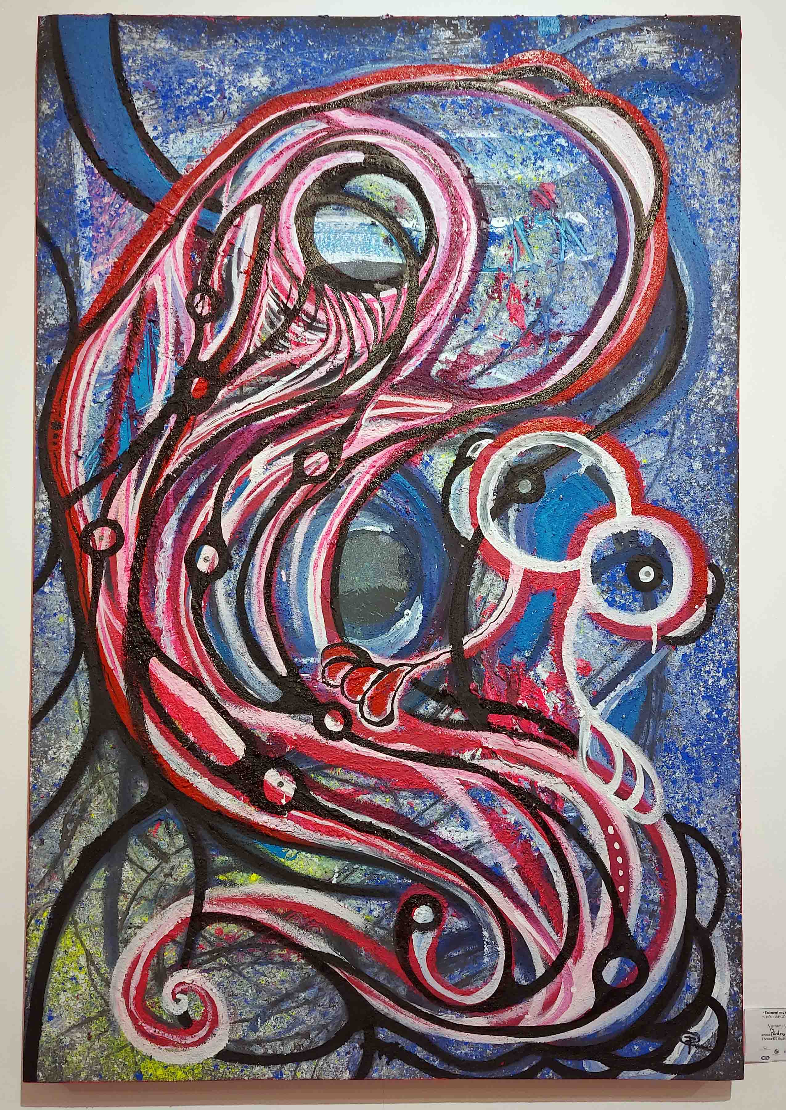 En un rincón de la sala el artista mexicano Pedro Zapala presenta tres obras al público. El joven representa de forma abstracta imágenes de peces, sombreros cónicos vietnamitas y manos utilizando como colores principales el rojo y el negro, lo que atrae mucha atención de los visitantes. Al respecto, Zapala informó: “En esta ocasión yo creé tres obras, que significan mi llegada a Vietnam, mi estancia cultural y el choque con la gente, la cultura y el lenguaje y cómo funciona. Y luego, la tercera es lo que me llevo de esta bella cultura”.