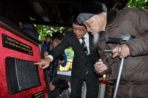 ![]() El guía enseña a un visitante anciano la plancha de xilografía de la dinastía Nguyen acerca de la isla de Ly Son y la soberanía nacional sobre el archipiélago de Hoang Sa (Paracel)