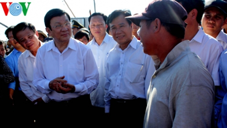 (VOVworld) – El presidente de Vietnam, Truong Tan Sang, al frente de una delegación central, el 3 de julio, visitó a pescadores de Da Nang, miembros del Departamento del Control de Pesca 3 y soldados en los barcos de Policía Marítima 2012 y 2015 que acaban de regresar a tierra firme tras cumplir de sus servicios en el Mar del Este.