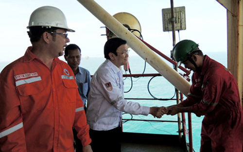 ![]() El presidente de Vietnam (m) felicita a trabajadores de Vietsovpetro que desempeñan la función en la reserva de Bach Ho (Tigre Blanco)