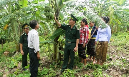 ![]() Soldados del puesto fronterizo Lao Bao instruyen a aldeanos laosianos de Ka Tang el cultivo del plátano