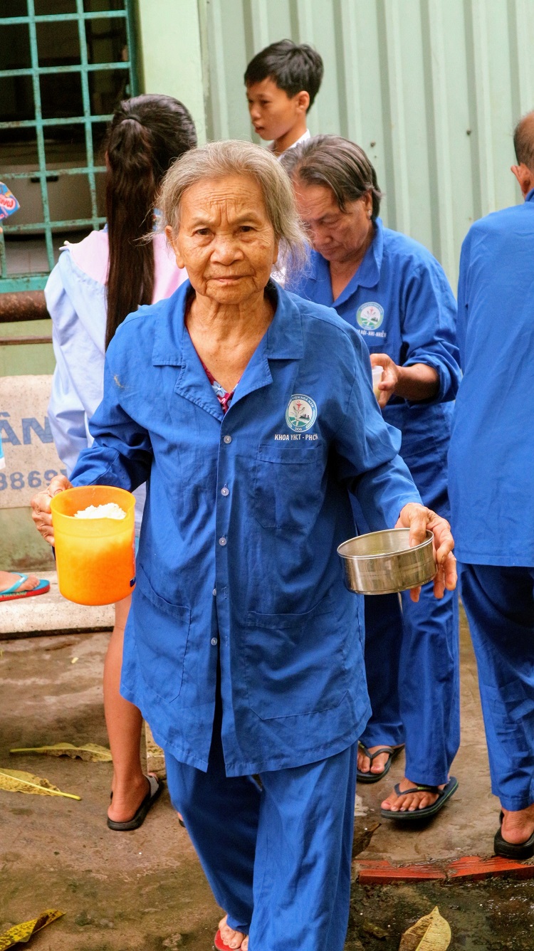 Como de costumbre, los miembros de la cocina madrugan para preparar el arroz y gacha de este grano que luego servirán a los pacientes internados con escasos recursos económicos. La edad de los voluntarios oscilan entre 50 y 70 años pero todos mantienen su dinamismo y trabajan con devoción para crear los platos que aderezan con muchos deseos de pronta recuperación para esas personas desafortunadas. Huynh Thi Anh Tuyet, miembro veterana del grupo comentó que ayudar a los necesitados la hace feliz. “Tengo 3 hijas, todas casadas. Ahora mi marido y yo participamos en las actividades humanitarias. Él se encarga de transportar verduras y yo preparo las comidas. Estamos muy felices al ver el progreso de los pacientes”, reveló Anh Tuyet.