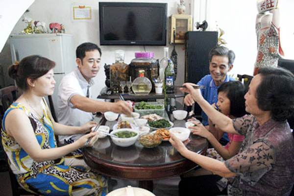Como de costumbre, durante décadas, la comida familiar cuidada por Tu Hoa reúne a 3 generaciones bajo el mismo techo. El comer conjuntamente se ha convertido en una práctica diaria. Se trata de una ocasión para que cada miembro transmita su amor mientras que los niños expresen la piedad a los padres y abuelos, quienes por su parte, les enseñen la manera de comer, además de aconsejarles sobre los asuntos escolares y sentimentales. Esta es también una oportunidad para enriquecer la vida conyugal, contribuyendo a formar el buen comportamiento de los infantes.