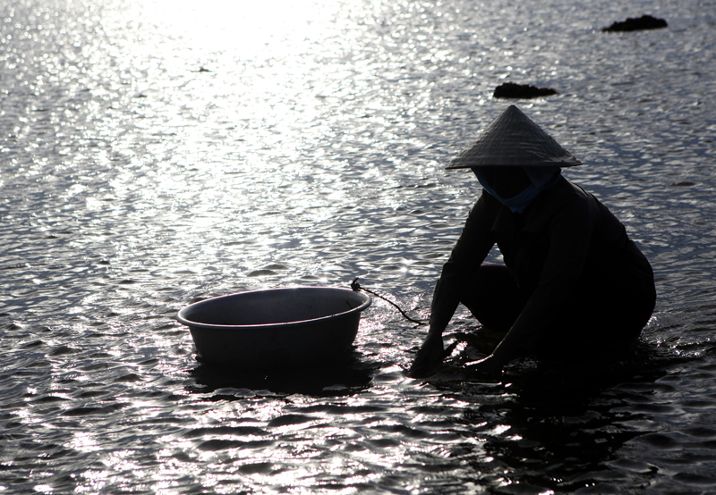 La señora Huong recoge algas
