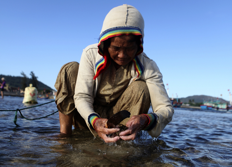 Numerosas personas, entre ellas la señora Le Thi Minh aprovechan la temporada de aguas bajas para capturar mejillones, caracoles de mar y peces para preparar las comidas familiares. En especial, los mejillones son fáciles de capturar y por eso casi todo el mundo acude a recogerlos. Minh dio a conocer: “Después de procesar, este monto de mejillones se puede llenar un cuenco grande. Con estos, podemos preparar comidas rehogadas mezclando con papayas, verduras encurtidas o fideos de harina de arroz. Además, se puede optar por cocinar gachas de arroz”.