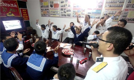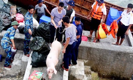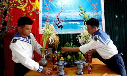 Informados de la llegada de los visitantes, los soldados de los puestos de radar y guardafronteras preparan fervientemente manjares para recibir la delegación con las ollas de verduras y pollos, cultivados y criados por los combatientes y mariscos capturados por los pescadores locales desde la madrugada. Phan Thi Men, esposa del primer teniente Pham Tho Truong, encargado de la operación de radar del puesto 505 en la isla Hon Chuoi, quien acaba de llegar de Thai Binh para visitar a su marido reveló: “Aunque no viene todavía el Tết, los combatientes están muy ocupados preparando con entusiasmo manjares para los visitantes. El convite para hoy dispone de casi todas las comidas del Tết para la delegación. Todos se sienten muy felices”.