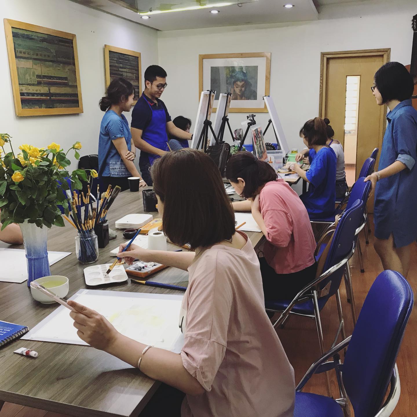 El maestro Than Van Cuong, un antiguo estudiante de la Universidad de Bellas Artes de Vietnam, guía a los aprendices en esta tarea. Los alumnos son jóvenes, tienen entre 20 y 35 años, y se sientan alrededor de una mesa rectangular sobre la que descansan brújulas de varios colores y pinceles de todo tipo. A veces, intercambian palabras para instruirse mutuamente sobre cómo trazar y cómo mezclar los siguientes colores al estándar. Pero en la mayor parte del tiempo de la clase, cada persona está enfrascada en su trabajo o colorear o diluir colores.