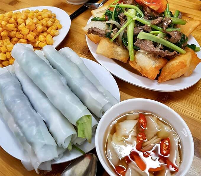“Hoy probamos muchos platos locales, incluso hicimos un recorrido gastronómico por Hanói durante todo el día. Como nunca habíamos probado el “Pho cuon”, decidimos buscar en Google y encontramos este restaurante. Esta comida ligera consiste en una lámina hecha de arroz enrollada con carne de res y vegetales. Está rica y se siente su frescura al metértela en la boca”.