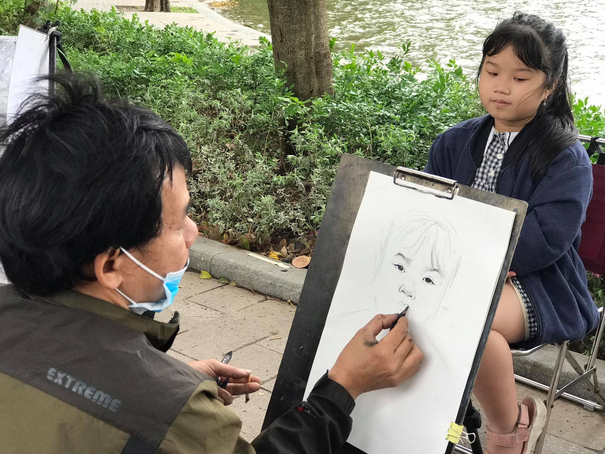 A diferencia del arte de “ve truyen than”, o sea, el dibujo de retratos a partir de fotos, en el cual se cuenta con mucho tiempo para perfeccionar el trabajo, el estilo de retratos realistas requiere que los artistas tengan la capacidad de recordar y dibujar rápidamente. En poco tiempo tienen que captar el verdadero carisma y los rasgos faciales peculiares para que se parezcan al modelo. Nguyen Van Ha, quien ha practicado este oficio por más de un año, compartió: “Los retratos realistas o visuales como éste sólo llegan a un nivel de precisión relativo, porque tenemos menos tiempo para completar la obra: sólo unos 10 a 15 minutos. Además, durante el tiempo en que dibujamos, es imposible obligar a los clientes, especialmente los niños, a sentarse quietos. Por eso, el nivel de precisión del cuadro es sólo del 70-80%, pero este estilo de dibujo contiene sus propias características de libertad y generosidad, así como refleja la mente individual en un cierto momento”.
