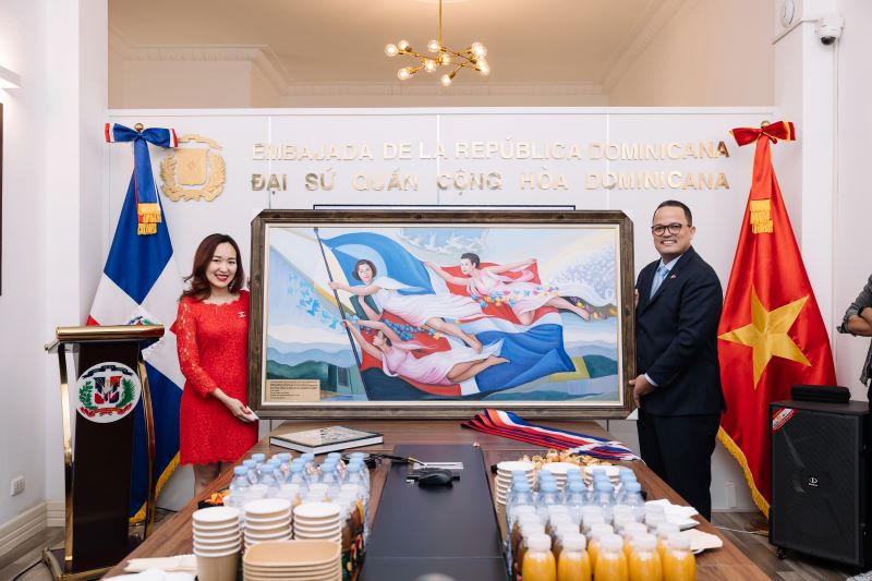El embajador dominicano realiza una entrega de donación de un cuadro de las hermanas Mirabal y un libro sobre Patrimonio Nacional de la República Dominicana a la Universidad de Hanói y la Universidad de Ciencias Sociales y Humanidades de Ciudad Ho Chi Minh por su participación y contribución al certamen. (Foto: Anh Thư/VOV) |
