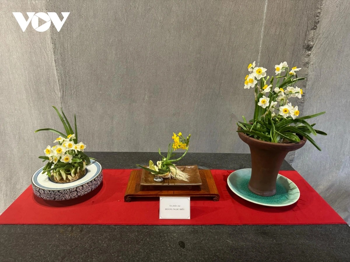 Junto al melocotonero, el narciso ocupa un lugar destacado en el Tet hanoyense. Se le atribuyen “cinco cualidades”: la flor, las raíces, las hojas, la forma y el aroma. Los aficionados no se limitan a adquirirlo; lo trabajan con paciencia y precisión, recortando y modelando cada bulbo hasta alcanzar una composición armónica.