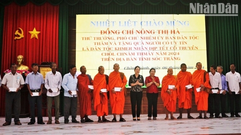 (VOVWORLD) - Ce samedi, une délégation de la commission des Affaires ethniques, dirigée par sa vice-présidente, la vice-ministre Nông Thi H, a rendu visite à des Khmers de la province de Soc Trang, à l’occasion de la fête traditionnel Chol Chnam Thmay.