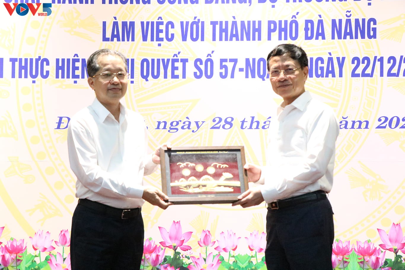 Le ministre Nguyên Manh Hùng remet un cadeau souvenir aux autorités de la ville de Dà Nang. Photo: Vinh Thông – Long Phi / VOV |