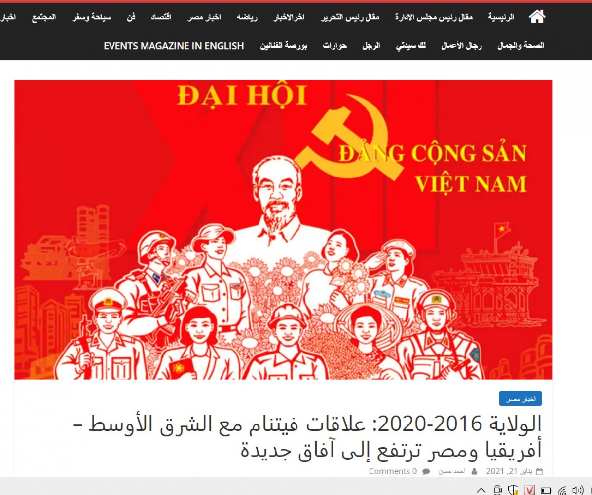 Le 22 janvier, le journal Eventsmagazinenews avait publié un commentaire du journaliste Ahmed Hassan saluant la coopération efficace entre le Vietnam et l’Égypte durant la période 2016-2020. Sous la direction du Parti communiste, le Vietnam a engrangé de réels succès au cours des 4 dernières décennies, avait écrit Ahmed Hassan.