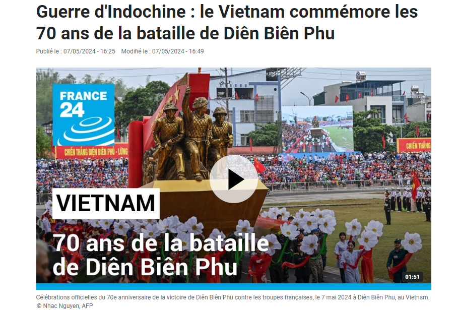 Le quotidien Le Figaro a publié un article intitulé «Les 70 ans de Diên Biên Phu: le Vietnam en fête avec la France comme invité». «La présence du ministre des Armées Sébastien Lecornu et de la secrétaire d'État en charge des Anciens combattants et de la Mémoire Patricia Mirallès témoigne de la réconciliation à l'œuvre, sur fond d'intérêts stratégiques en commun. Les relations entre les deux pays autrefois en guerre sont aujourd'hui cordiales», peut-on lire dans cet article.