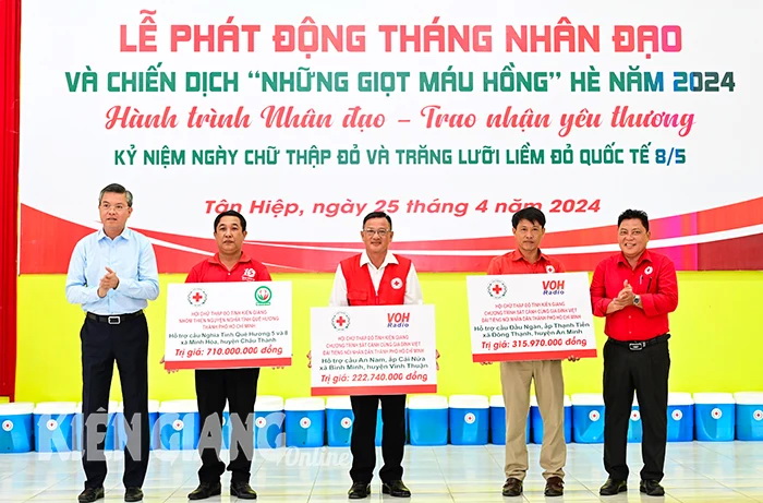 Le vice-président du Comité populaire de la province de Kiên Giang, Nguyên Luu Trung (extrême gauche) et le président de l'Association provinciale de la Croix-Rouge, Luu Kim Oai (extrême droite lors de la cérémonie (photo: baokiengiang) |