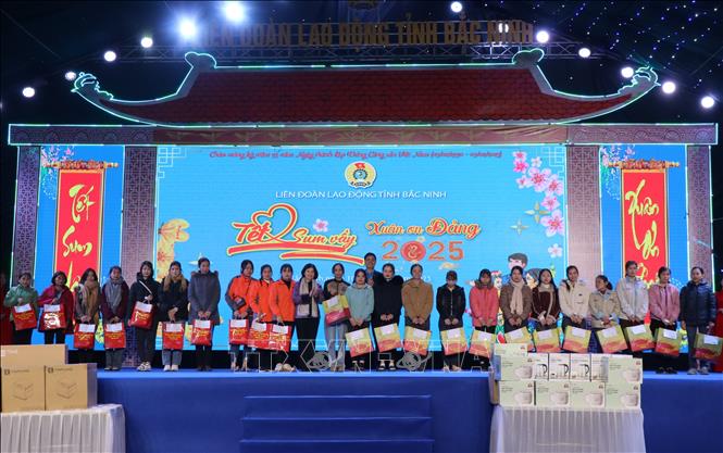 À Bac Ninh, les délégués provinciaux offrent des cadeaux aux travailleurs dans le cadre du programme "Réunion du Têt – printemps de gratitude envers le Parti". Photo: Thanh Thuong/TTXVN) |