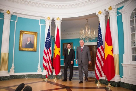 ![]() Le vice-Premier et ministre des Affaires étrangères Pham Binh Minh (à gauche) rencontre le secrétaire d’Etat américain Rex Tillerson. Photo: Ministère des Affaires étrangères du Vietnam |