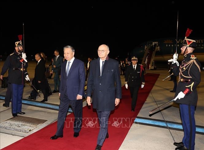 Arrivée du secrétaire général et président Tô Lâm à l'aéroport d'Orly. Photo: TTXVN |