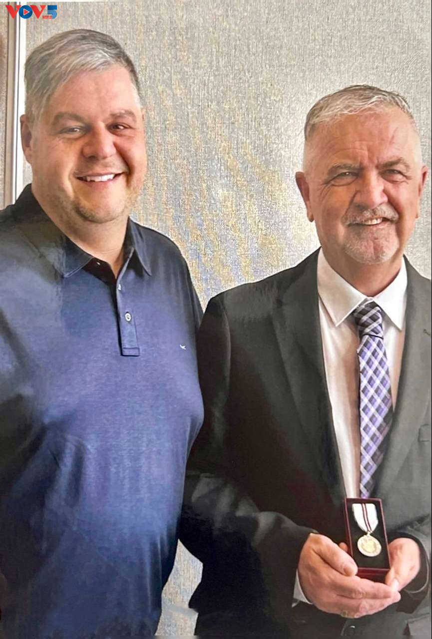 Roger R. Roussel (droite) et sa médaille du jubilé de platine de la reine Elizabeth II |
