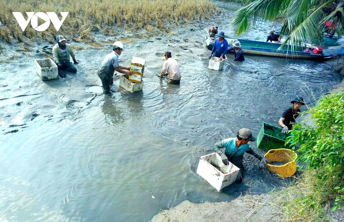 Après chaque moisson de riz, les agriculteurs profitent ainsi des rizières inondées pour élever les crevettes. Le delta du Mékong compte à peu près 160.000 ha où cette rotation culturale est pratiquée, notamment dans les provinces de Kiên Giang, Cà Mau, Bac Liêu et Soc Trang.
