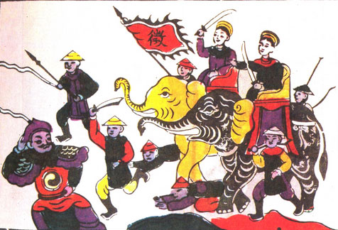 Une estampe populaire de Dông Hô rendant hommage aux deux soeurs Trung |