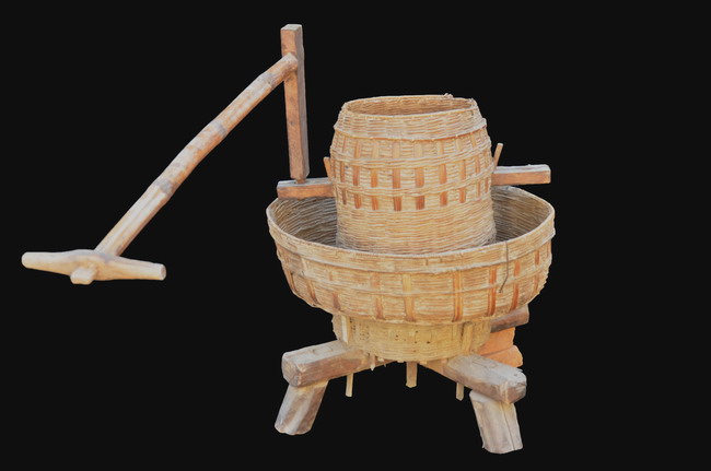 Le moulin à riz est un outil permettant de séparer le son et le grain de riz. La taille et la forme d’un moulin à riz traditionnel varient d’une région à l’autre, mais sa structure reste la même. Il est composé de deux meules superposées. La meule inférieure est fixe alors que la meule supérieure tourne autour d’un pilier central. Le pilier est en bois alors que les meules sont en bambou enduit d’argile. L’ensemble du moulin est posé sur un cadre à quatre pieds en bambou ou en bois.
