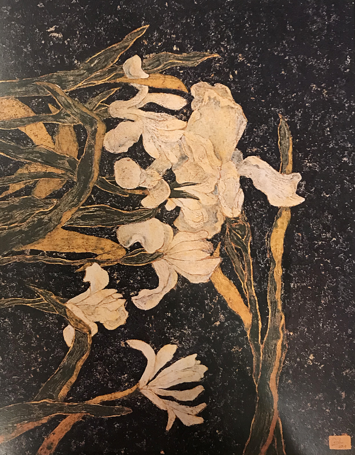 Pour que ses couches de laque sèchent, un tableau doit être mis à l’abri du vent, dans une enceinte close où le taux d’humidité est très élevé. Après un certain temps, le laqueur doit le poncer et le polir avant de voir le résultat, qui lui réserve souvent bien des surprises. C’est ce côté hasardeux qui a séduit Ngô Ngoc Phuong Anh, l’auteure de deux laques consacrées aux iris.