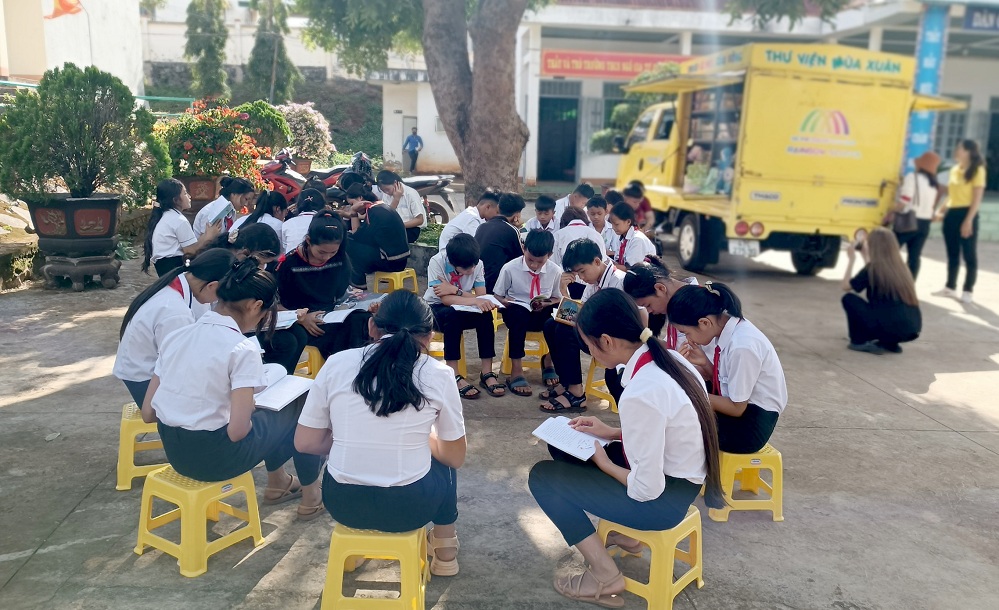 Dans l’enceinte du collège Tô Vinh Diên, sous les feuillages, un groupe d’élèves lisent à côté d’un camion jaune baptisé «Librairie du printemps». La chaleur accablante, le chant bruyant des cigales et le brouhaha des alentours semblent n’avoir aucun effet sur leur concentration.