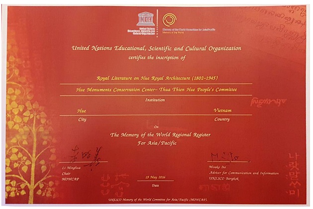 «Certains poèmes ont été gravés sur du bois qui allait ensuite être peints en rouge et doré, d’autres ont été gravés sur du cuivre émaillé… Mais tous sont des œuvres calligraphiques, les rois et les mandarins de la dynastie des Nguyen étant réputés pour être à la fois des poètes et d’excellents calligraphes.»